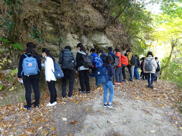 参加した受講生は、神戸層群の周辺を歩き、地層の露頭を観察したり、地層の下に落ちている石を用いて植物化石を探索したりしました。また、地層や化石に関する専門家の解説に耳を傾けました。その後、神戸大学に戻り、その日の体験を振り返り、お互いに共有しました。